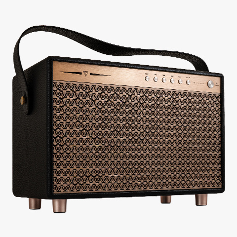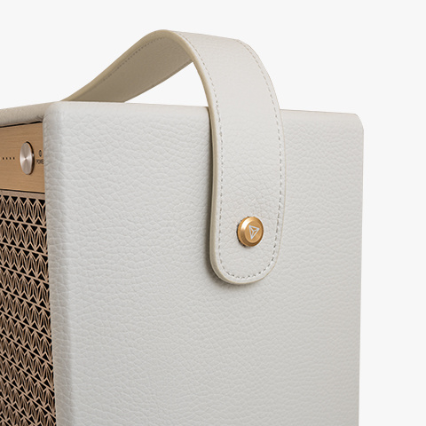 The natural and well-balanced sound image comes from the rigid midrange paper cone woofer that thanks to a special coating can perform at low and high volumes, and the silk dome tweeter with a high-quality neodymium magnet that ensures a crisp ant highly detailed sound. To make sure that the bass is powerful and precise the cabinet is made out of MDF and equipped with a reflex port, together with the acoustic feet these features minimize effect loss to vibrations and allows the woofer to perform to the fullest. The control panel and the custom Dynavoice grille are copper coloured, made out of anodised aluminium making them extra resilient, and the included strap makes the speaker easy to carry.